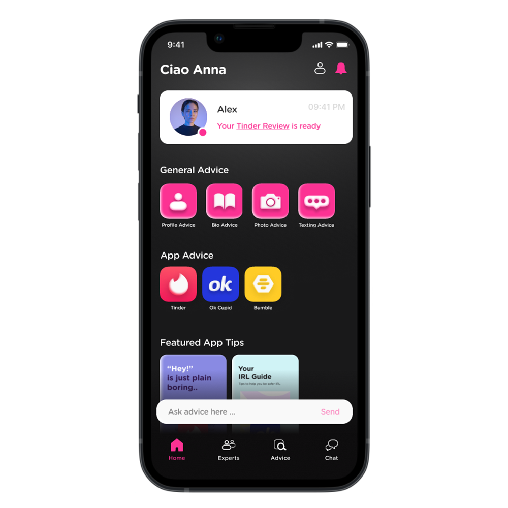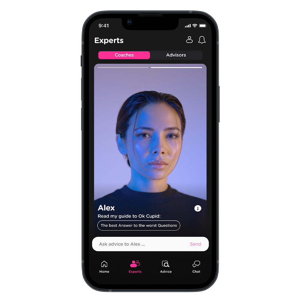 A dating advisor app to get tips and support on online dating for beginners or non-digital natives.