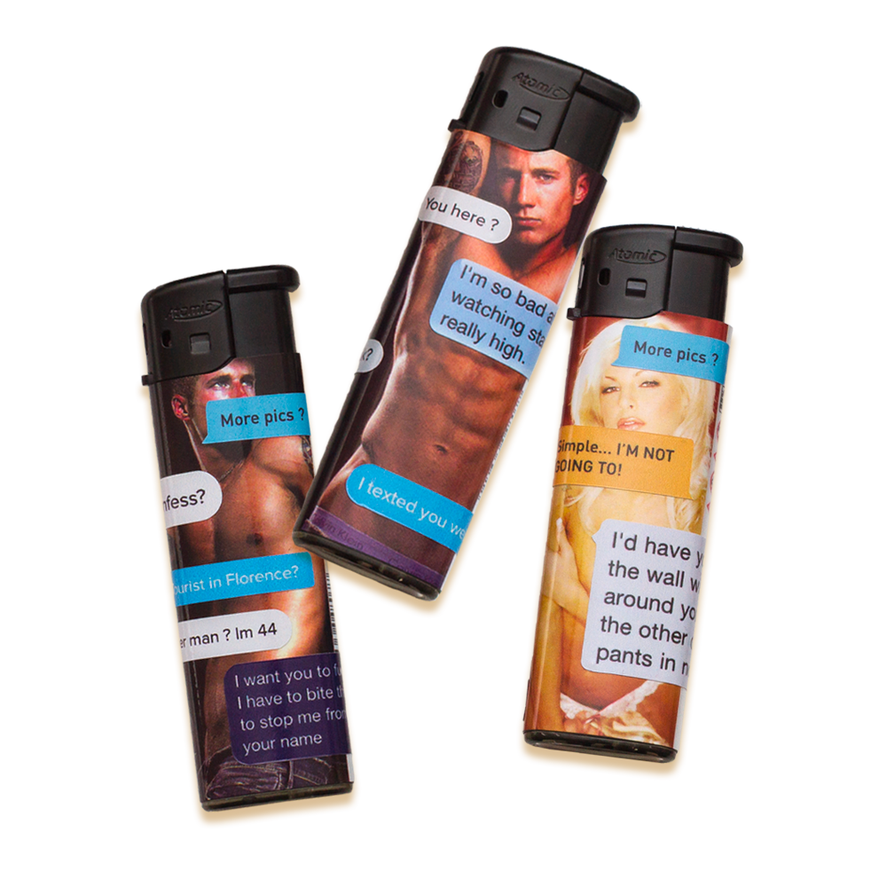 The lighter is refillable for endless pleasure. Featuring REAL Tinger/Grindr/Kik/Instagram messages as removable stickers.